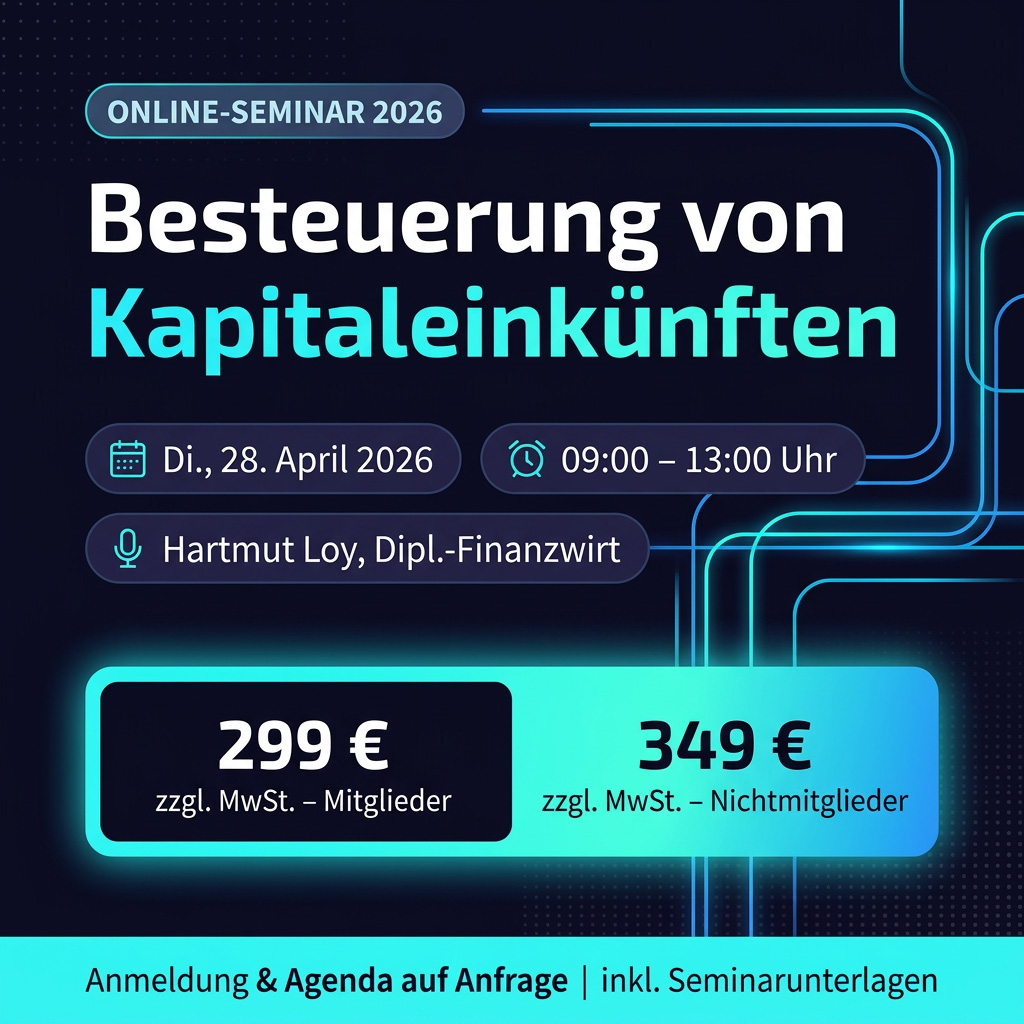 Zwischen neuen BMF-Schreiben und dem JStG 2024: Die Besteuerung von Kapitaleinkünften hat in den letzten Monaten eine massive Transformation erfahren. Wer jetzt nicht auf dem neuesten Stand ist, riskiert steuerliche Nachteile oder Haftungsfallen. Unser kommendes Online-Seminar bringt Licht ins Dunkel – mit einem der profiliertesten Experten Deutschlands.